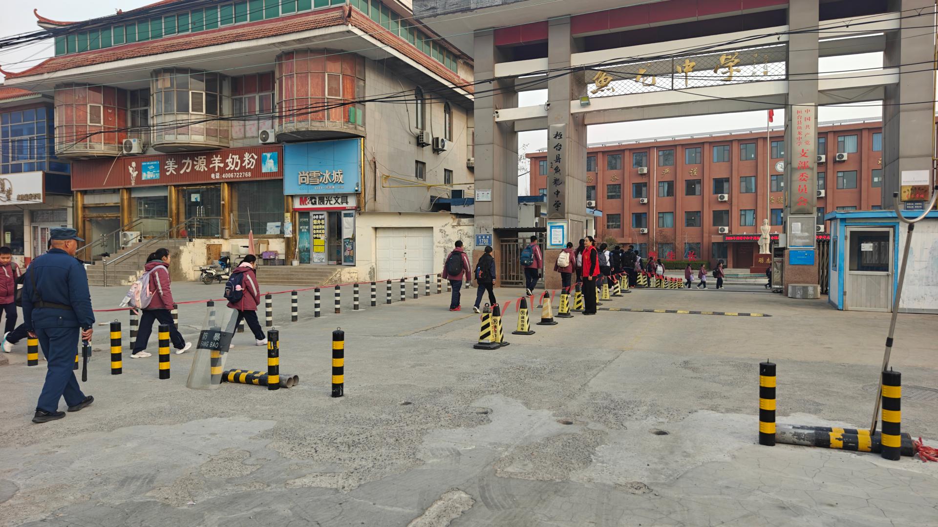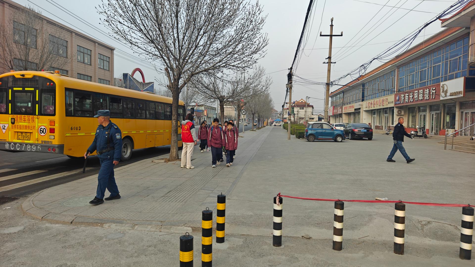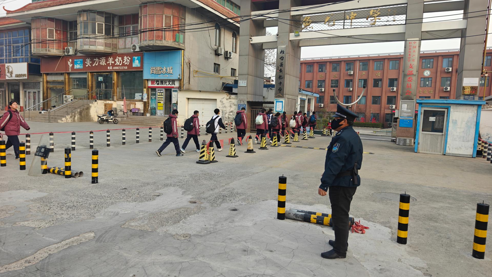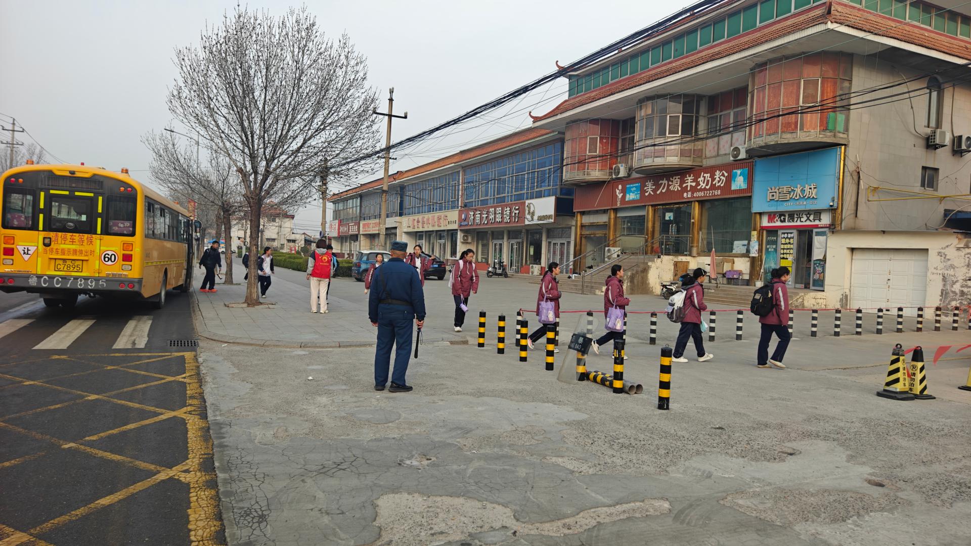 桓台县鱼龙中学为保障学生上放学期间的交通安全,招募部分教师志愿者进行交通安全疏导,家长有序停车,学生排队进校园。