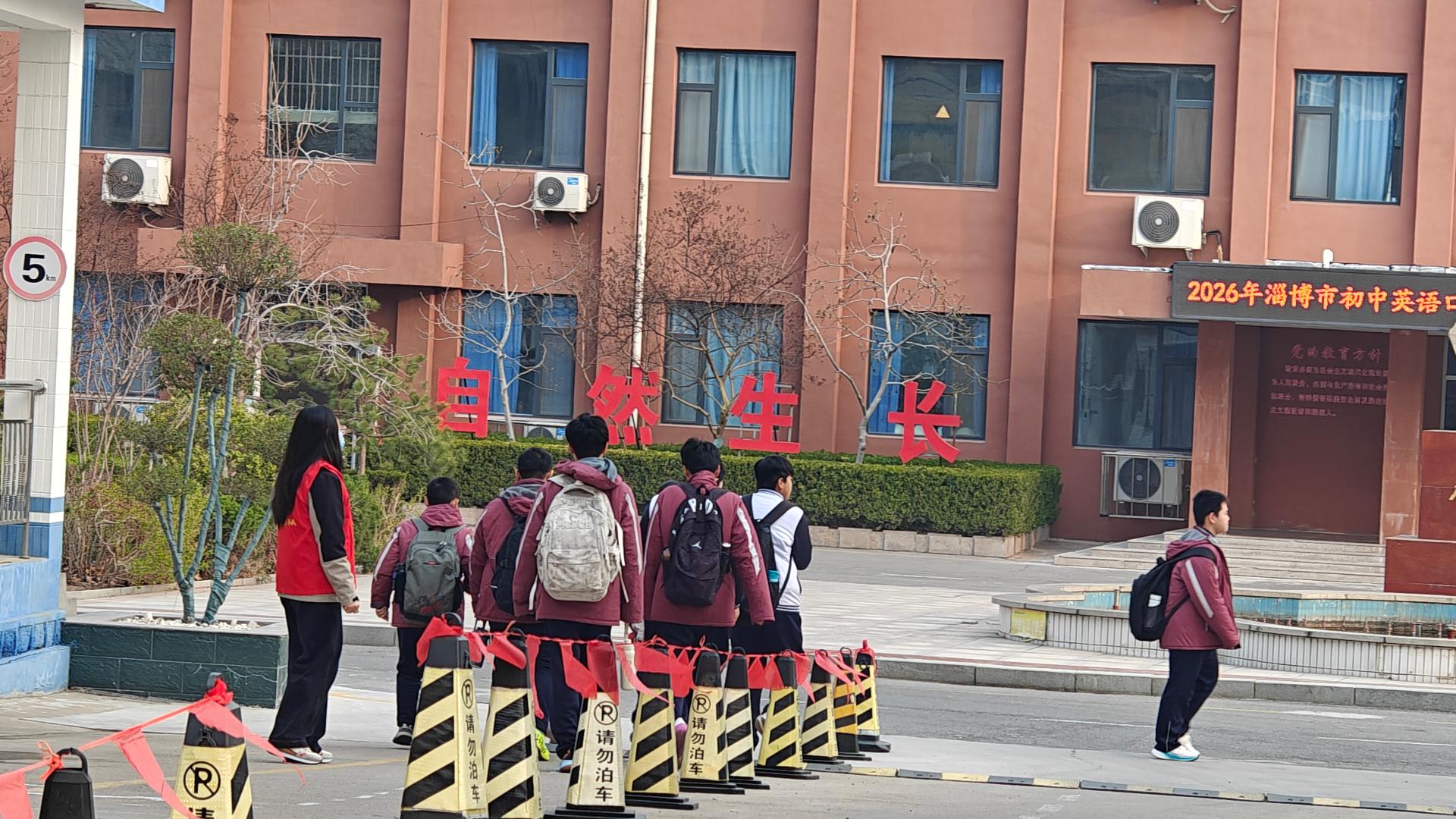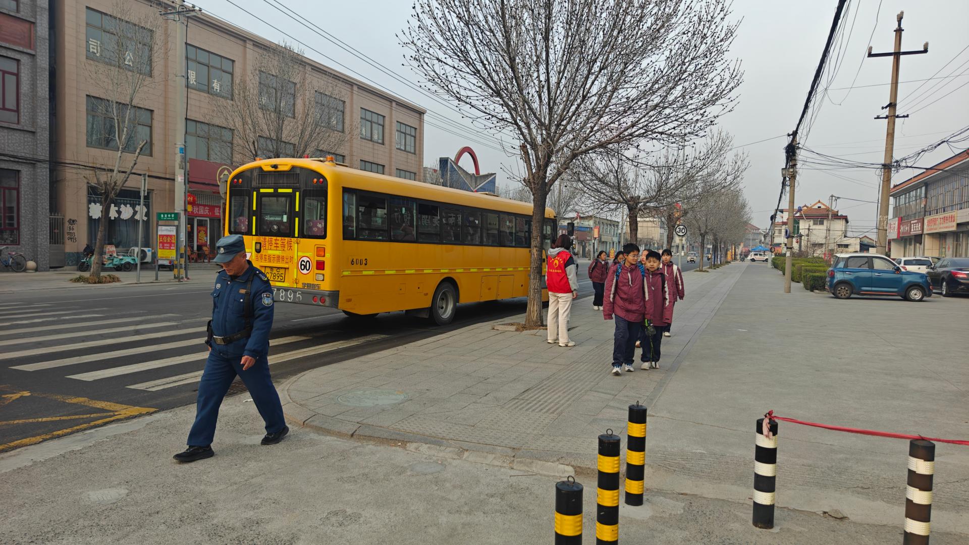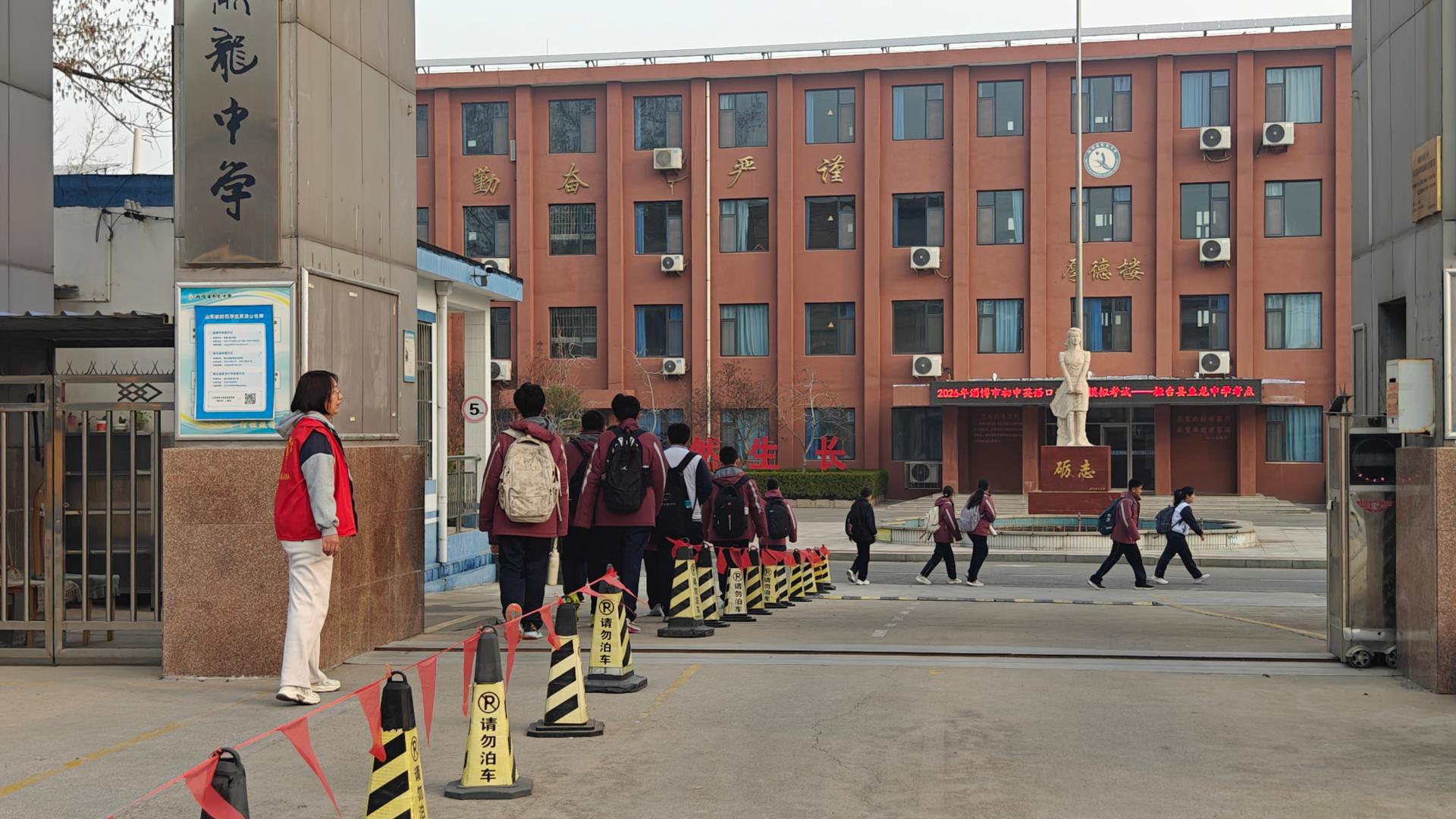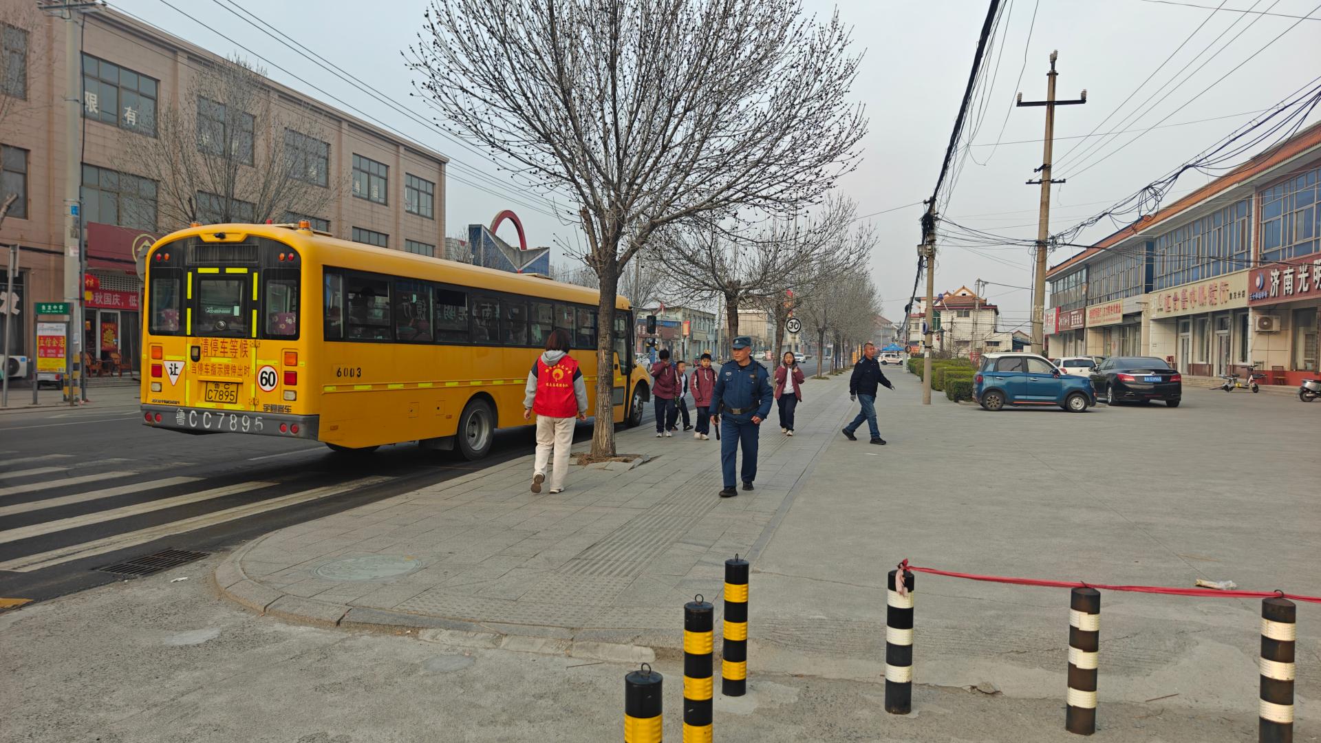 桓台县鱼龙中学为保障学生上放学期间的交通安全,招募部分教师志愿者进行交通安全疏导,家长有序停车,学生排队进校园。