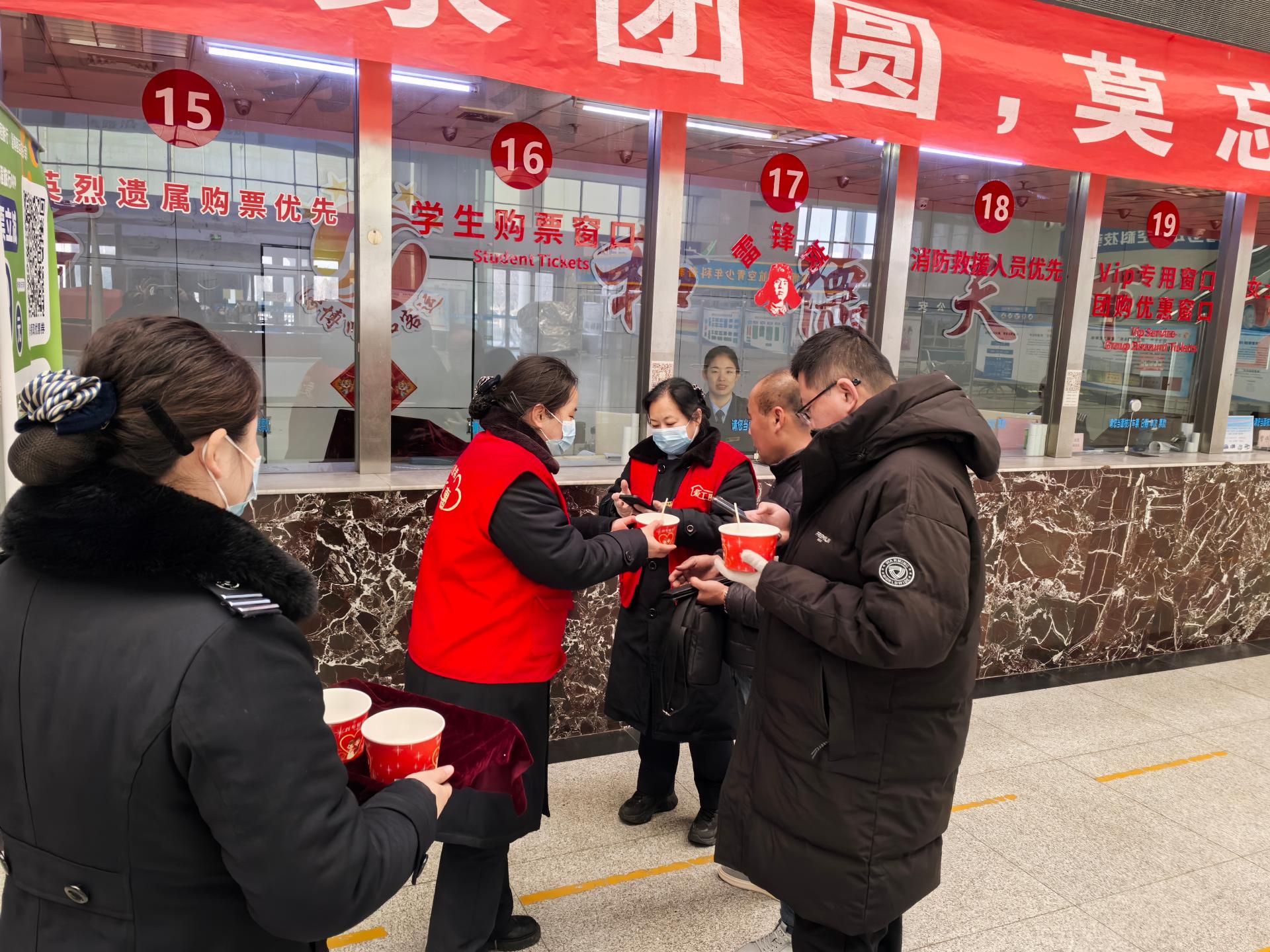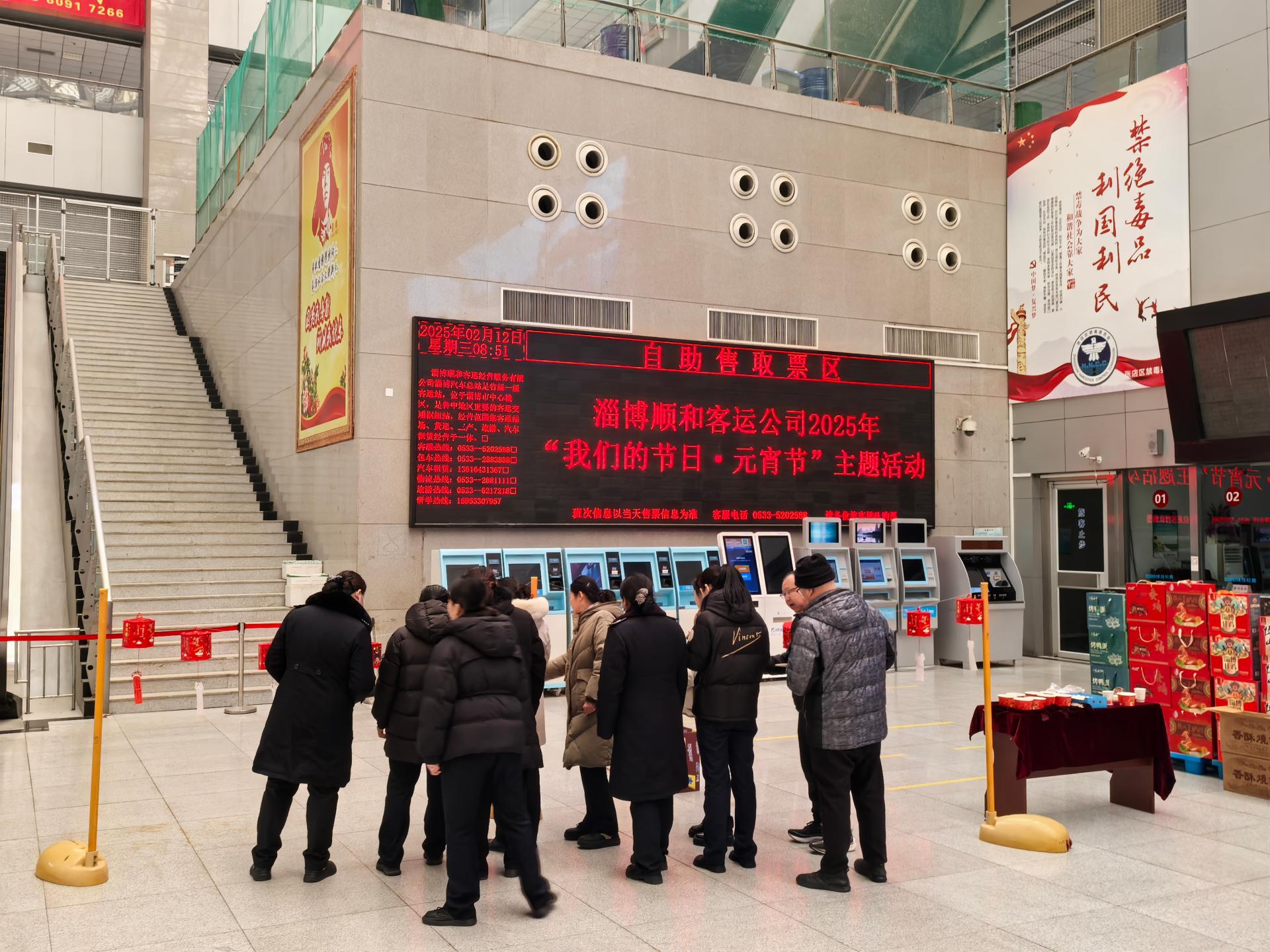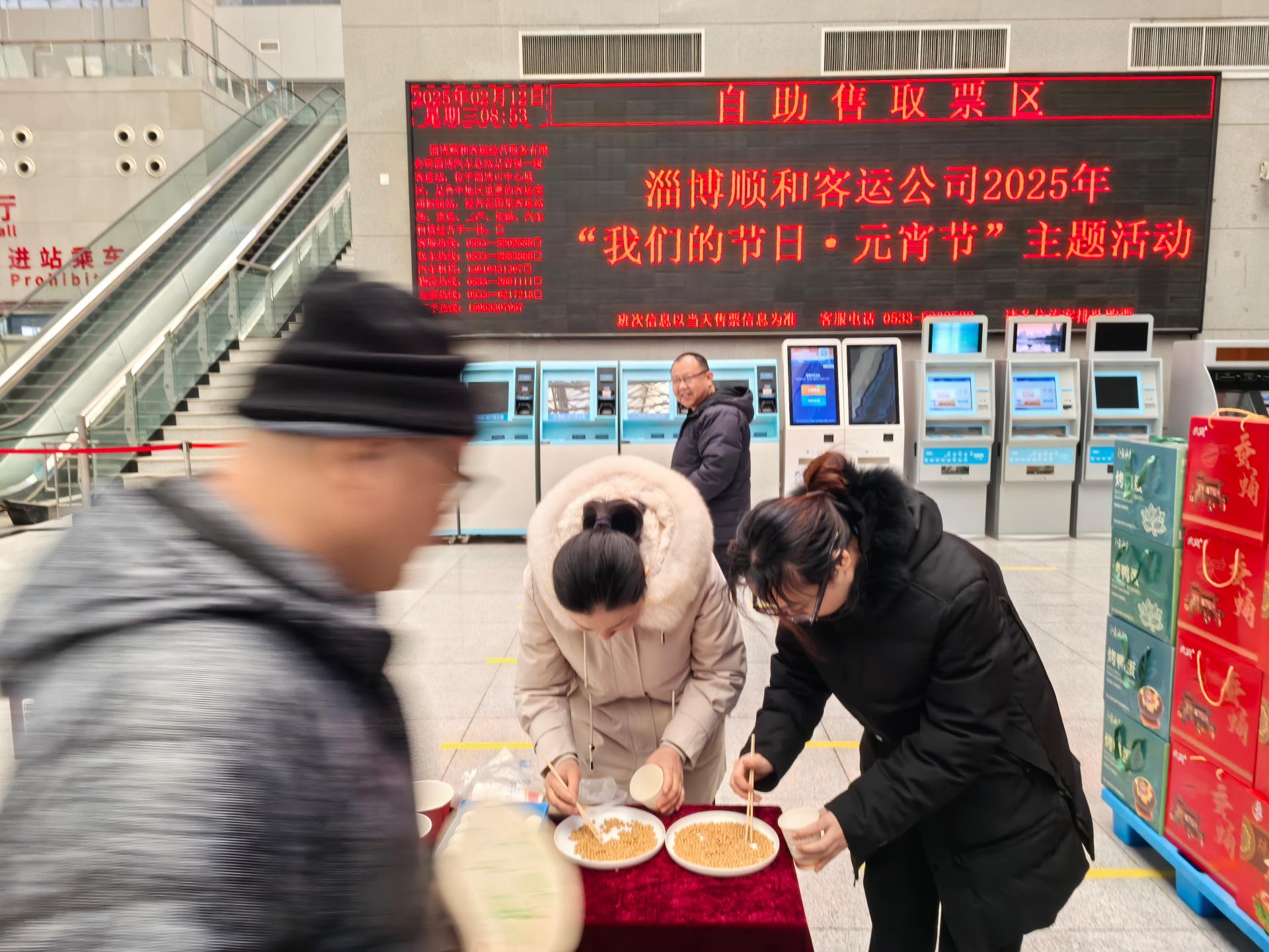 淄博顺和客运公司淄博汽车总站志愿服务队于2025年2月12日在客运中心一楼开展“我们的节日.元宵节”主题活动。志愿服务活动:志愿者分布各岗位引导旅客安检进站,实名购票乘车,回答旅客问询,帮助旅客推送行包,照顾特殊旅客,对旅客开展安全出行文明旅游知识宣传;“欢度元宵 庆团圆”活动:总站的志愿者们为旅客朋友精心准备了猜灯谜、踢毽子、套环赢礼品等小游戏,现场煮汤圆,吃汤圆,送祝福,携手旅客,共度元宵。让旅客感受总站浓厚的节日氛围和服务热情。 要求志愿者着志愿服务马甲,责任心强,待客热情,服务周到。