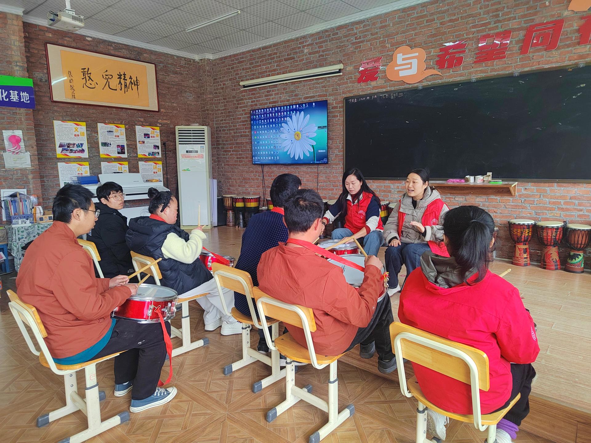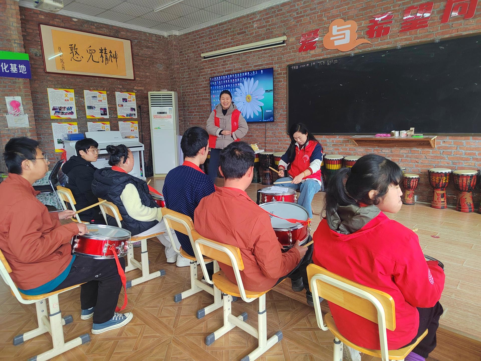2026年3月18日下午,淄博师专附属幼儿园走进憨兜家园进行军鼓支教活动,志愿者老师们给孩子们复习军鼓乐《康康舞曲》第一课时。