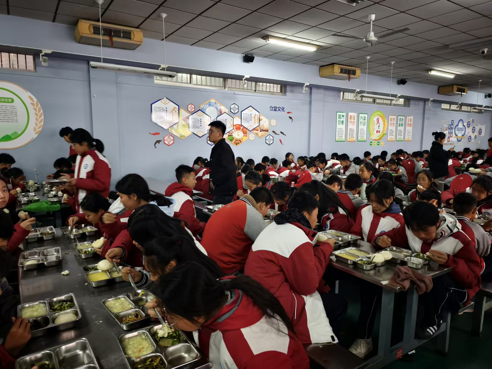 世纪中学教师志愿者每天中午进行餐厅值班,维持良好的用餐秩序,培养学生良好的用餐习惯,保证学生吃饱吃好,并能进行优质的午休。