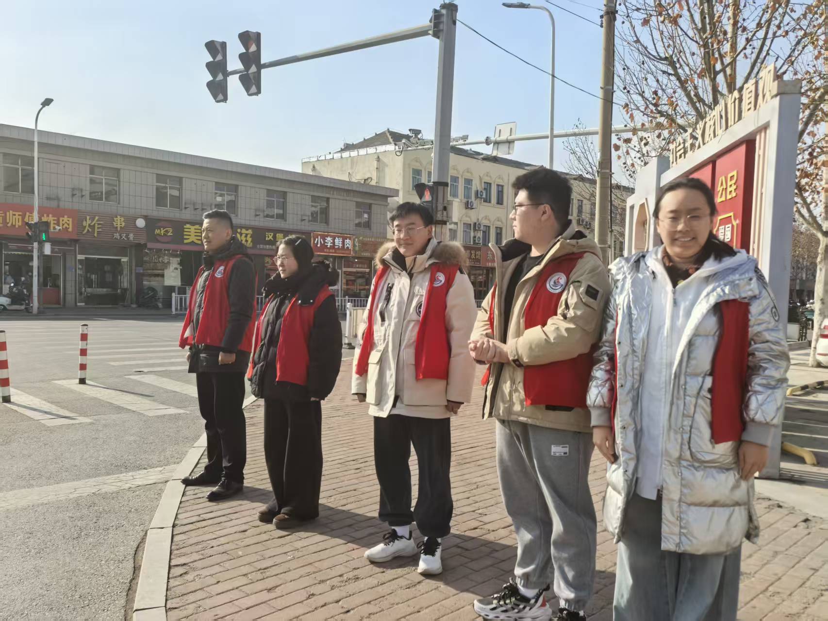 张店四中教师在校门口进行志愿服务活动,深刻践行志愿精神,提高学校文化建设及思想意识水平,践行雷锋精神。