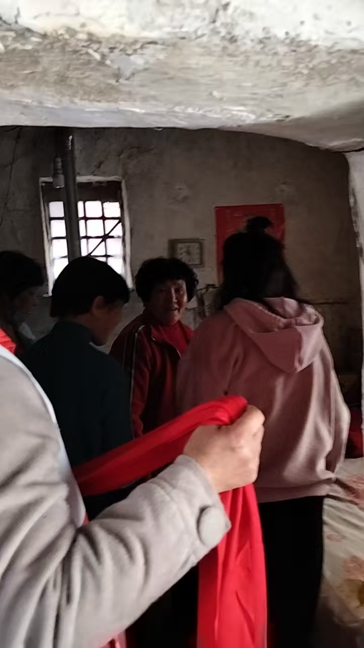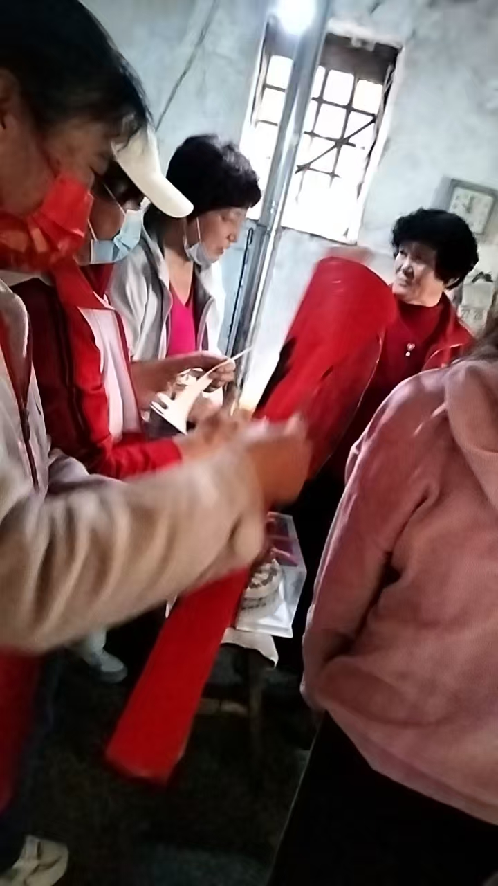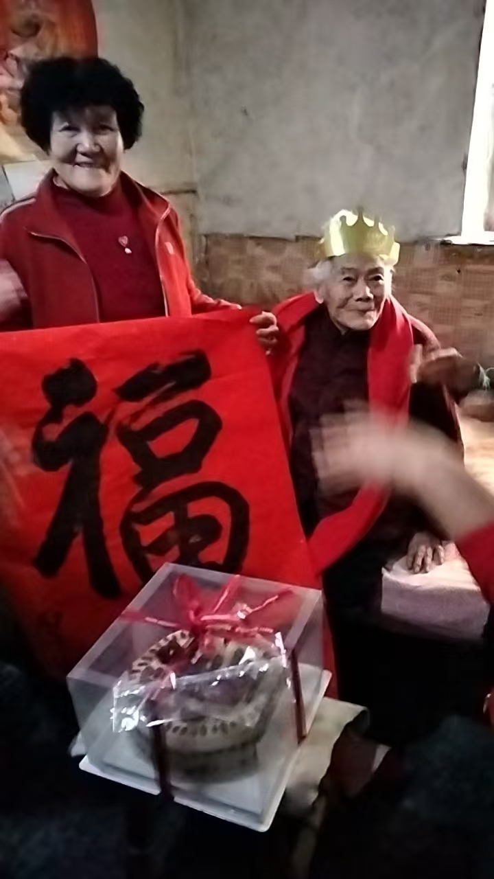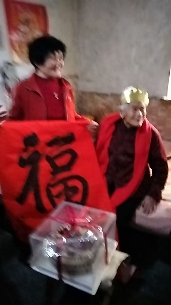 公益在线志愿者服务队为九十岁以上老人祝寿,第六年,第五次活动,老人九十九岁,为老人做寿糕,红围巾和大红福寿精彩文艺节目,宣传淄川孝道文化。