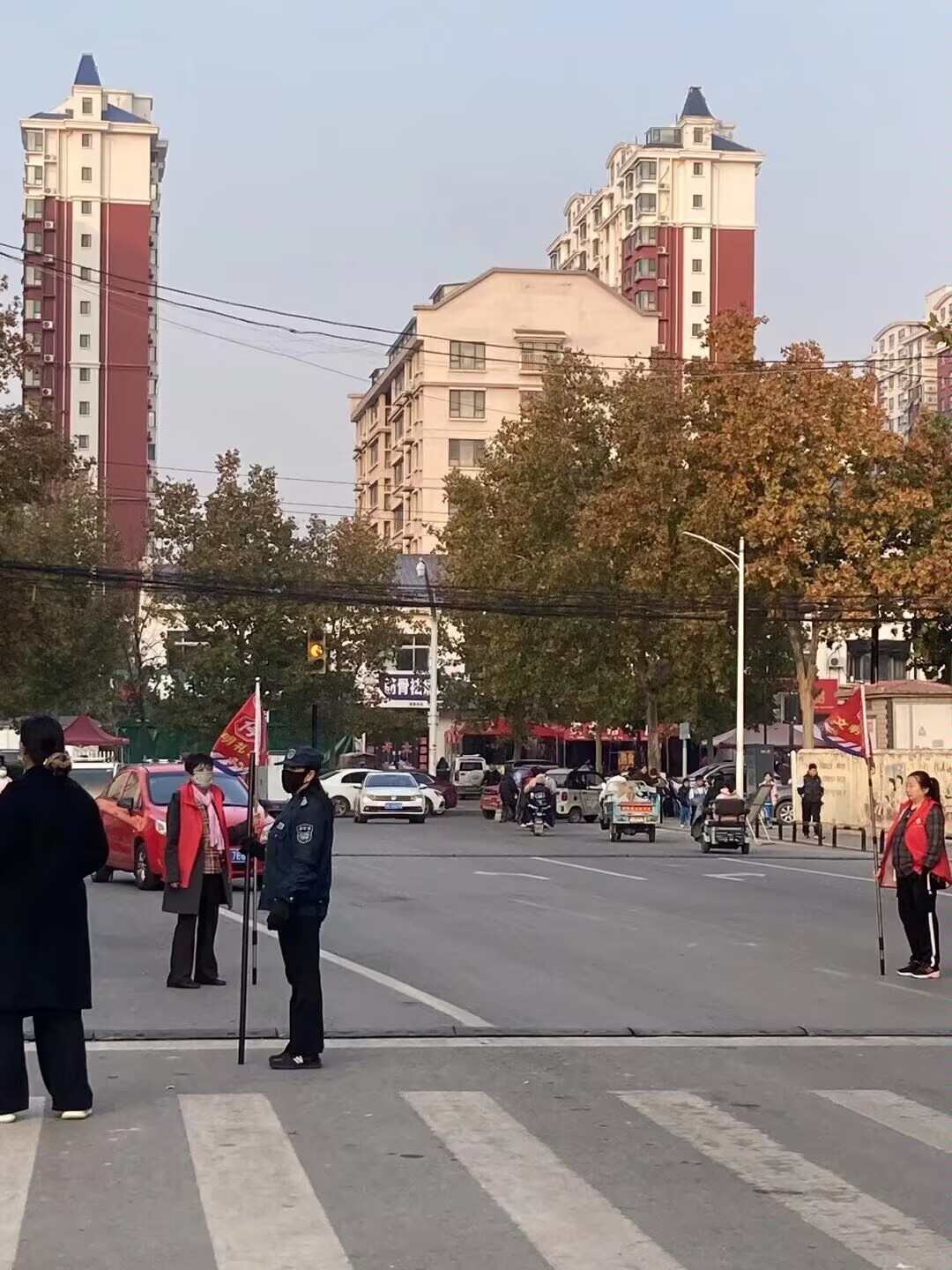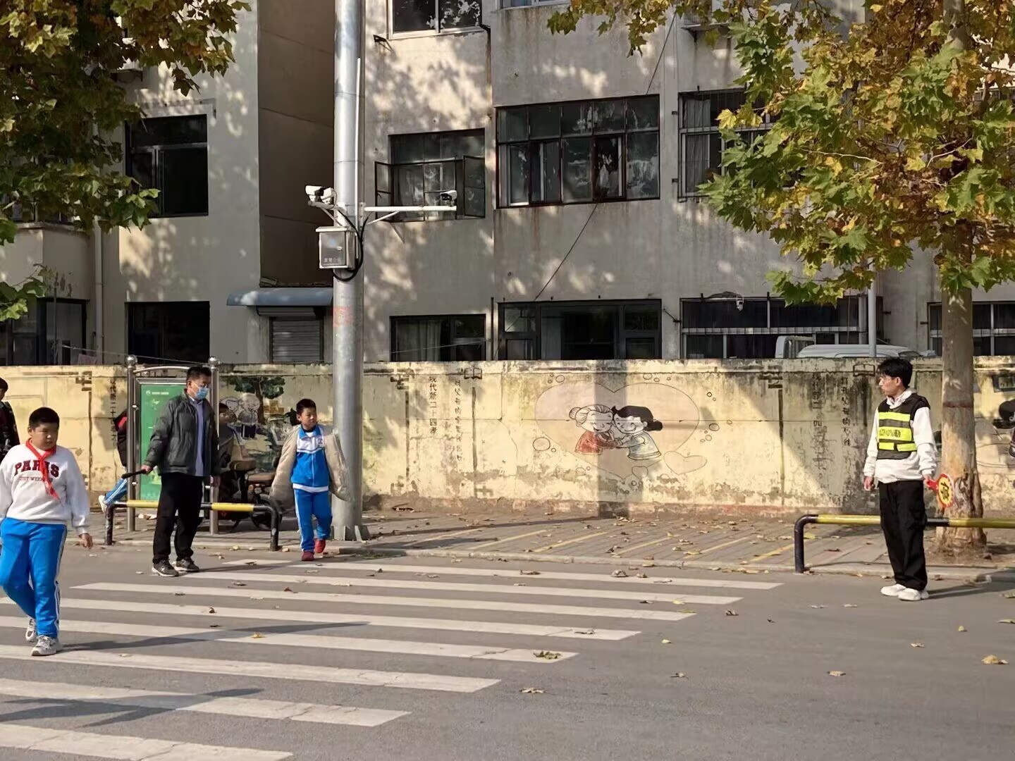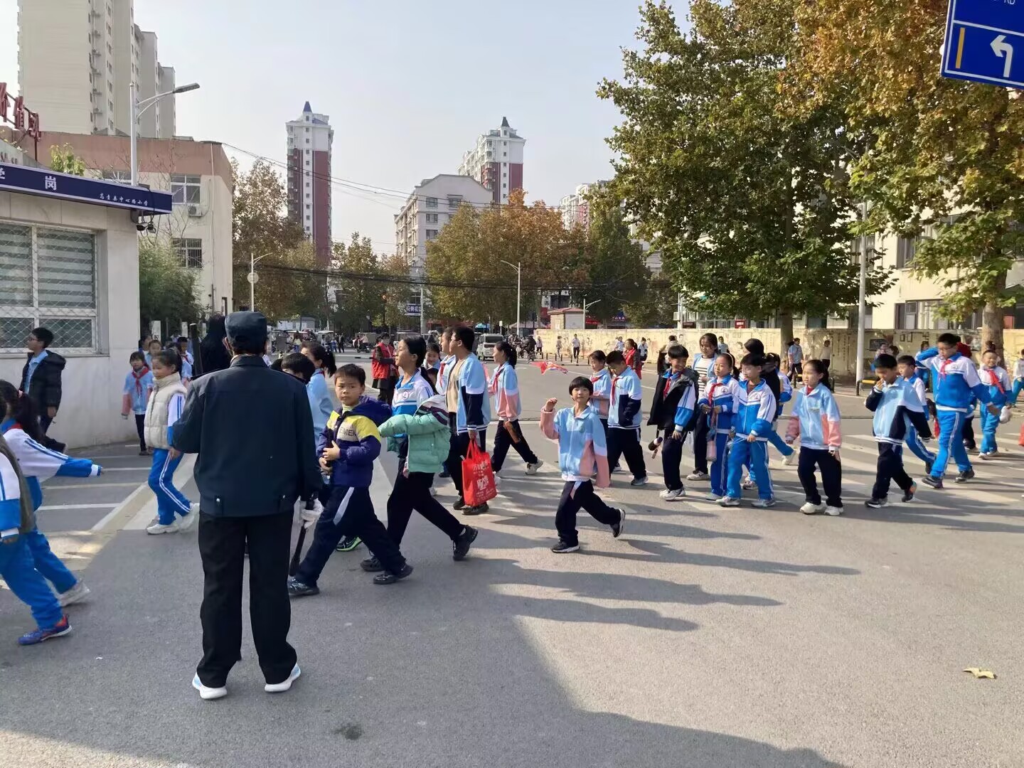 高青县中心路小学教师早晨、中午、下午协助维护学校门口的交通秩序,为学生创造一个安全良好的入校环境,让学生安全上放学。