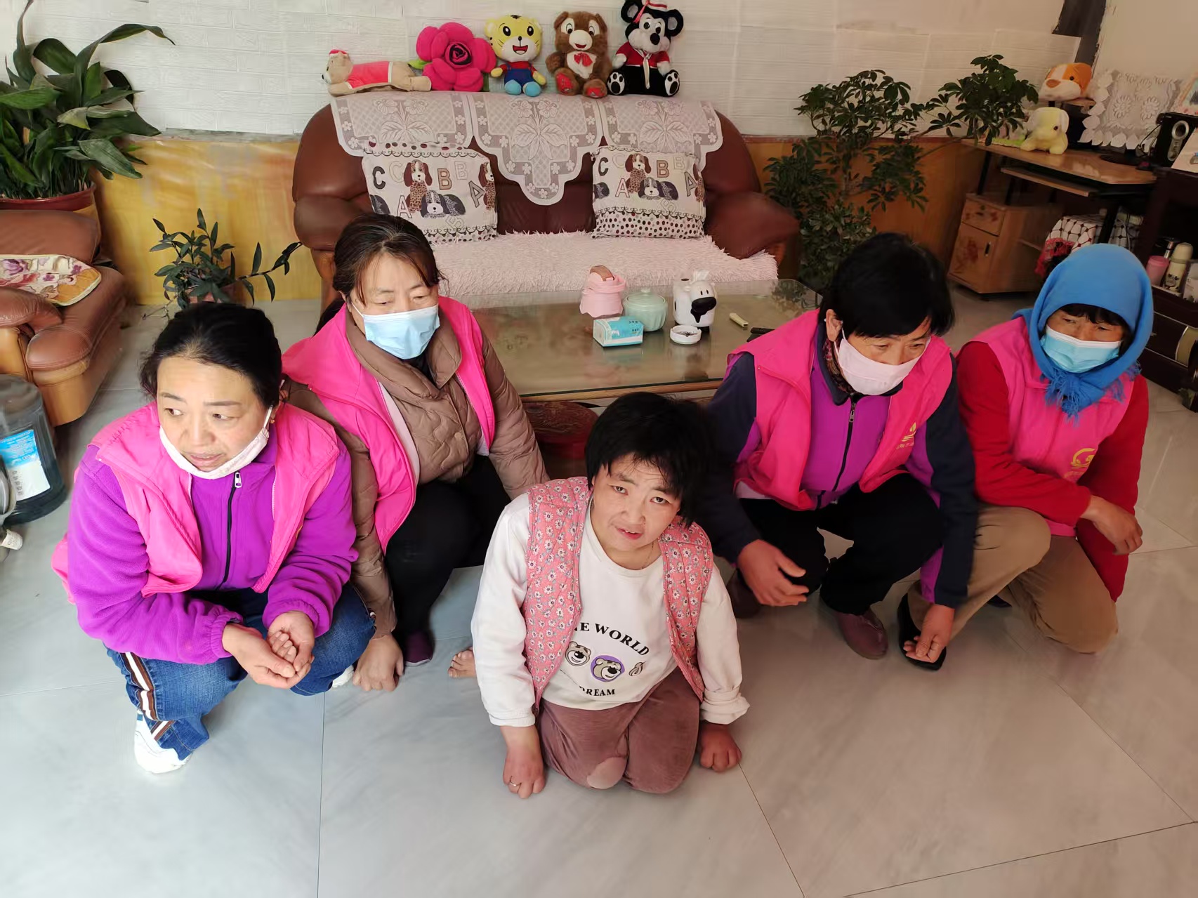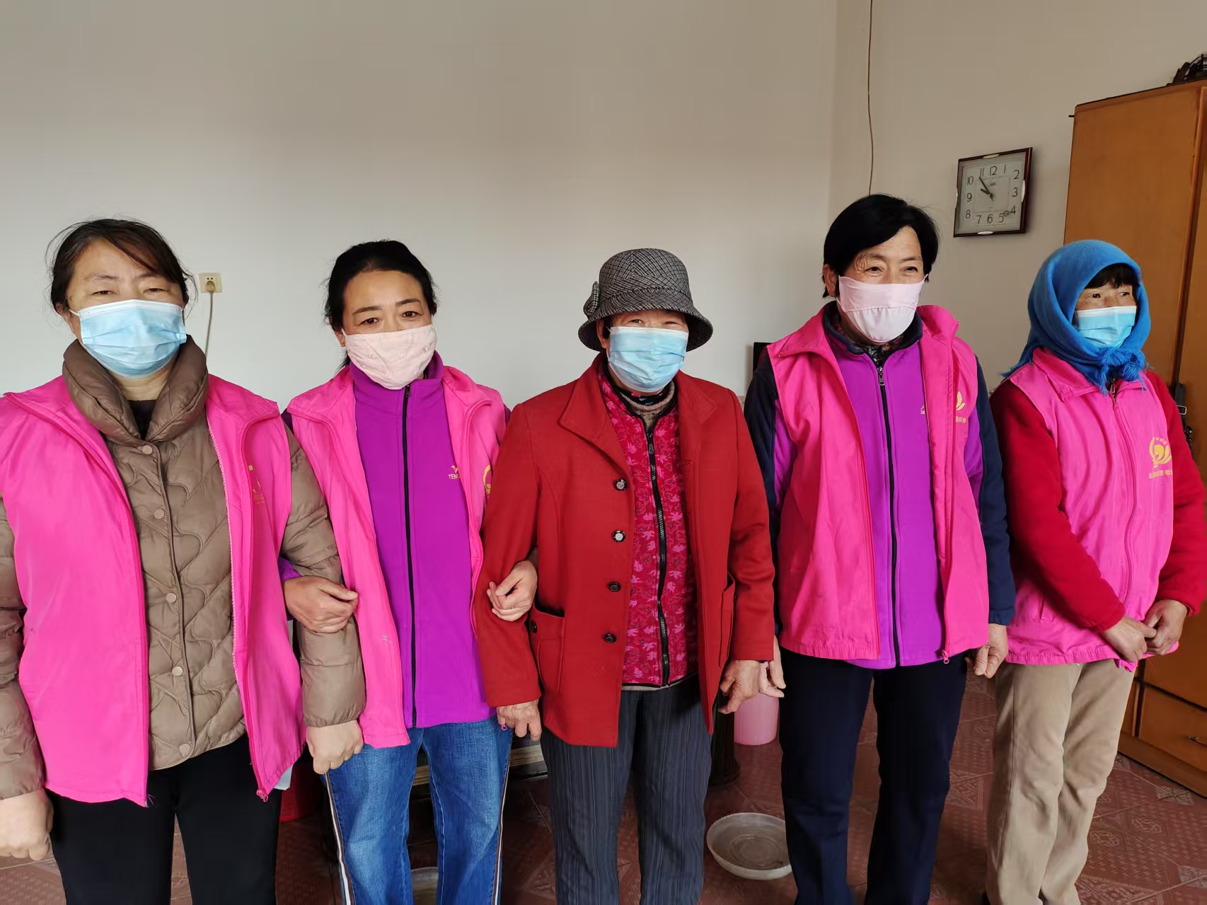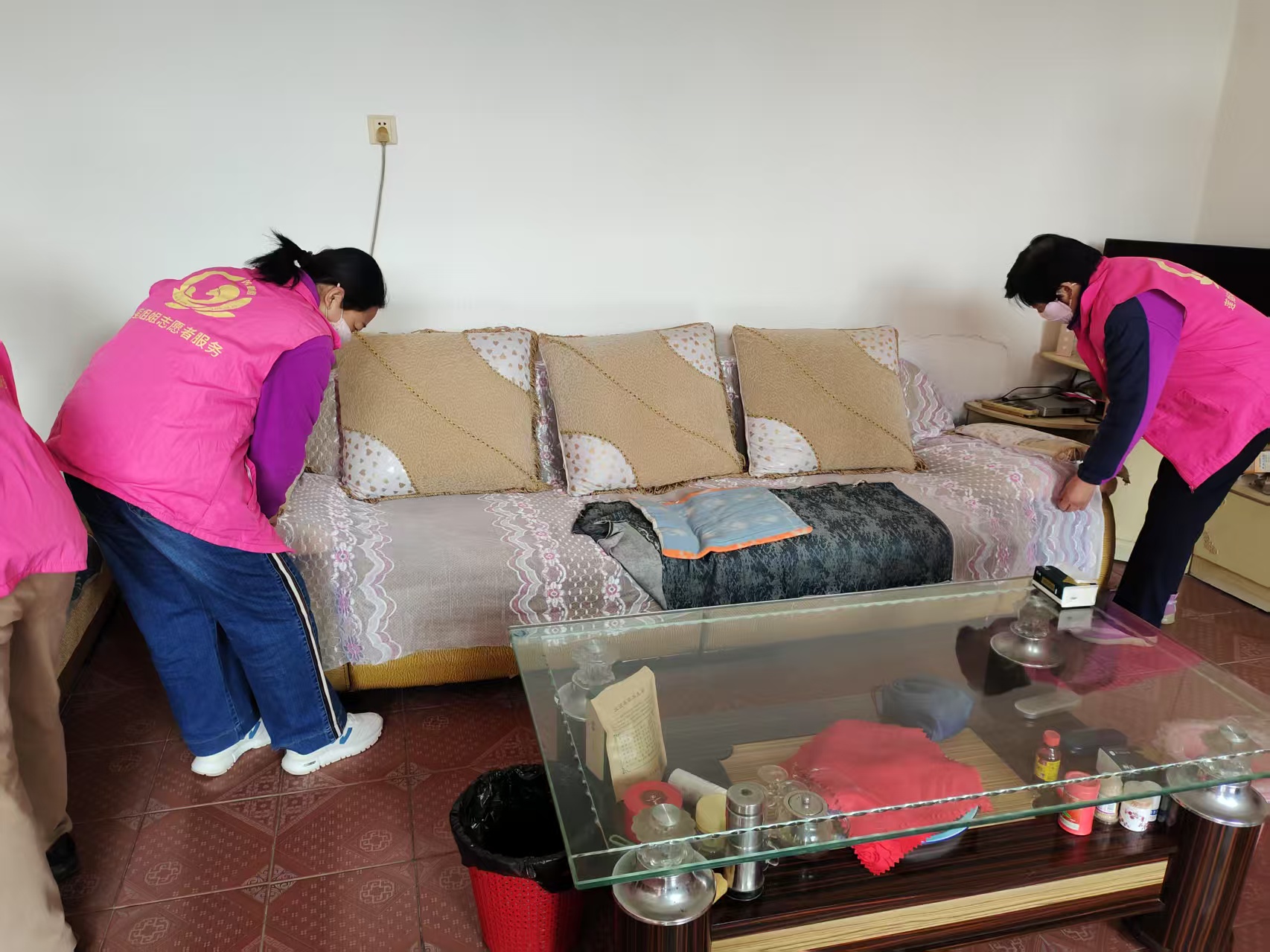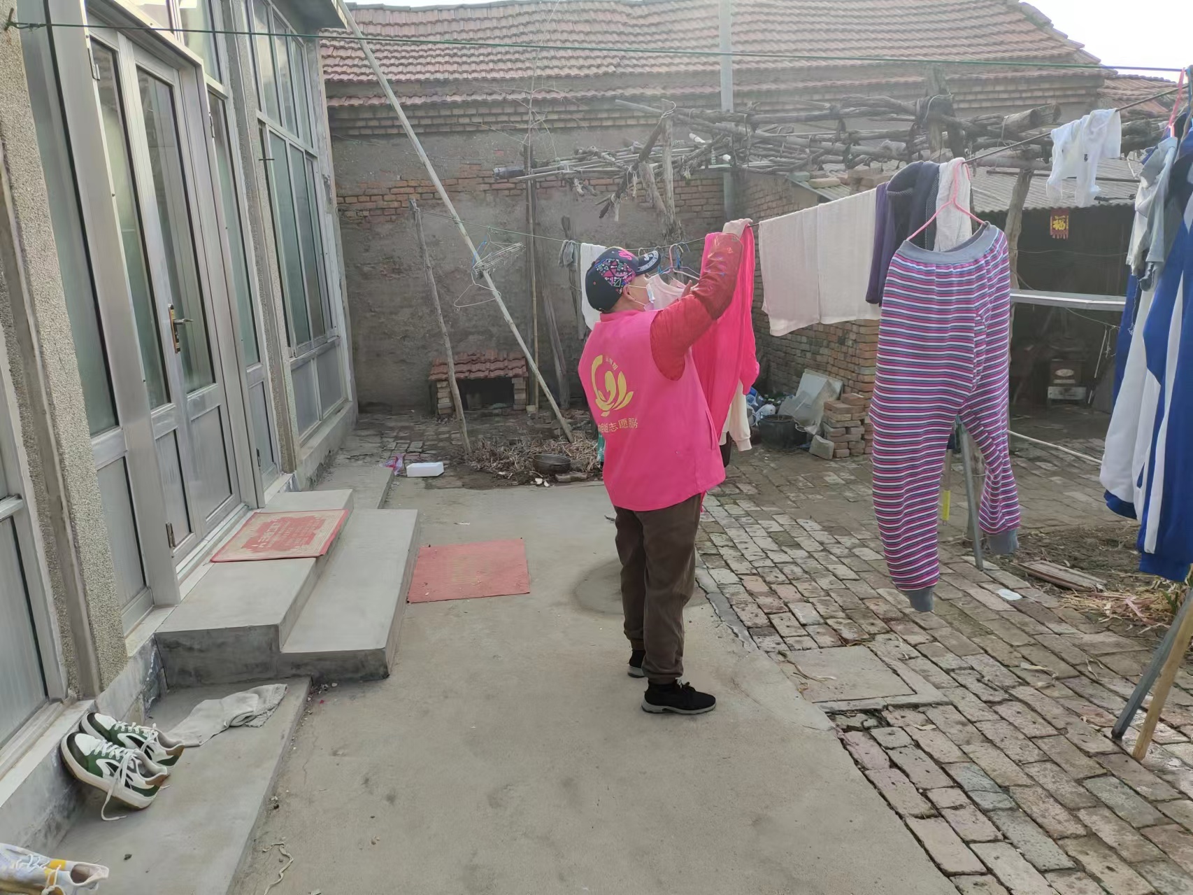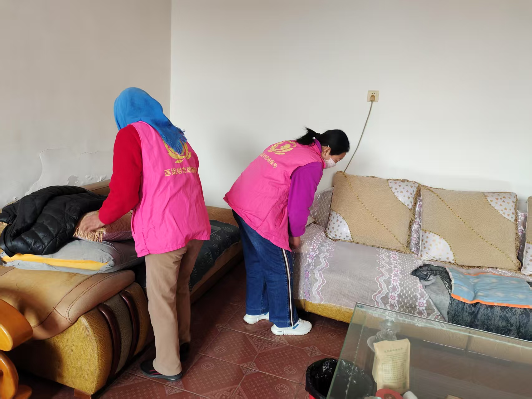 唐山镇演马村莲姐姐志愿者们一起为残疾人清理卫生工作。