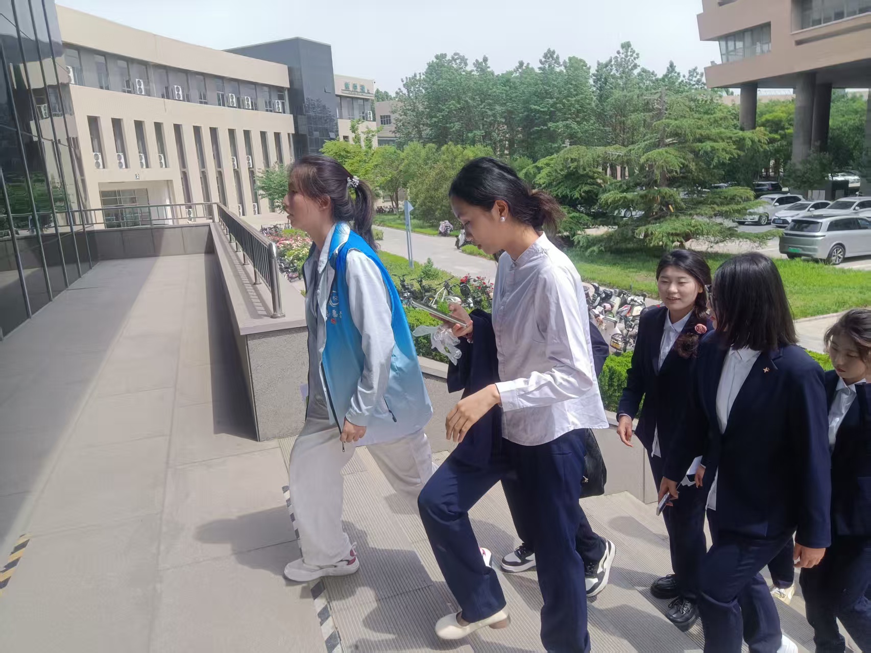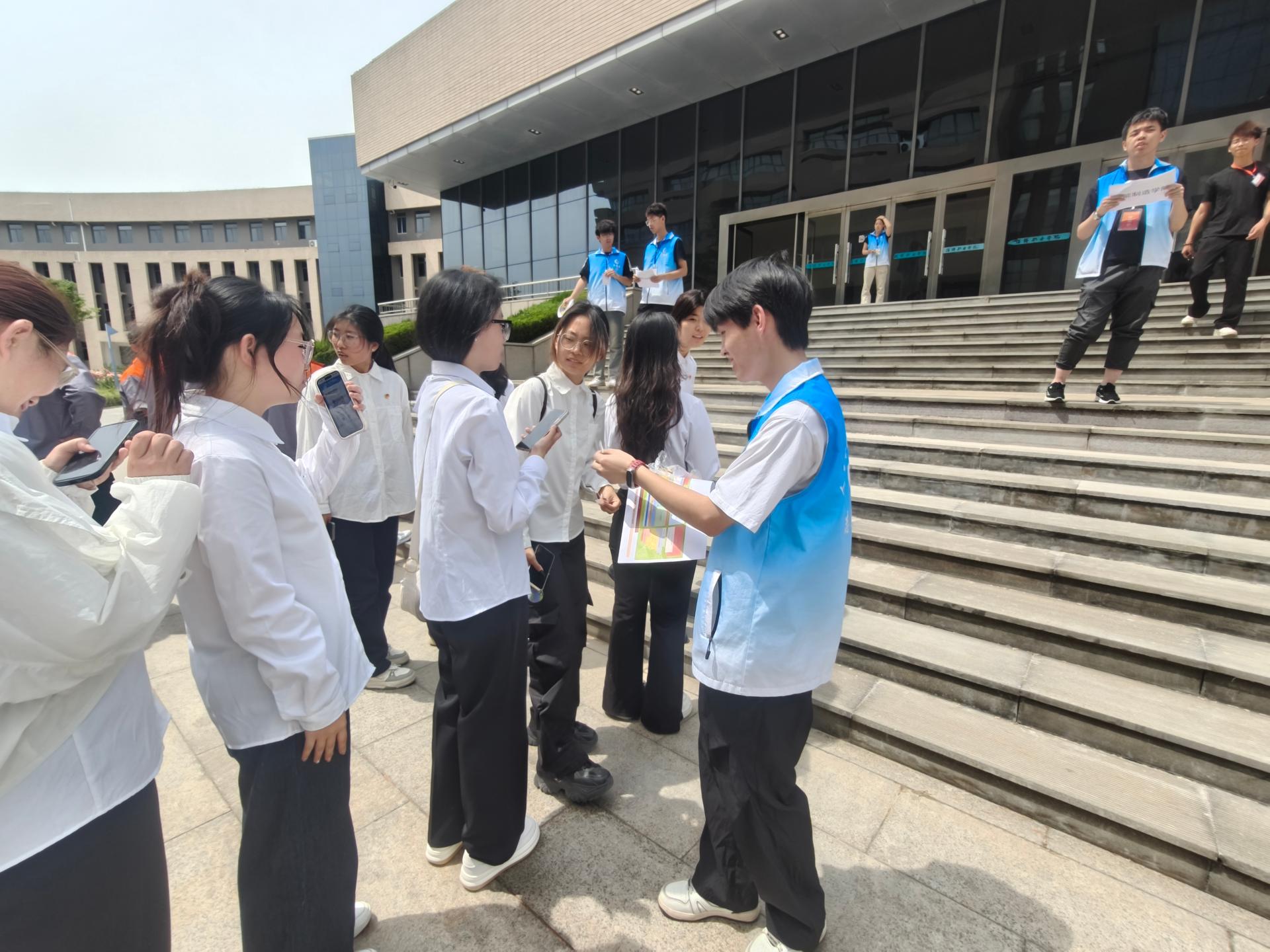 志愿者帮助老年大学的爷爷奶奶,从北校区门口进行引导将其带到匠技楼,爷爷奶奶在北校区进行听课以及展播.