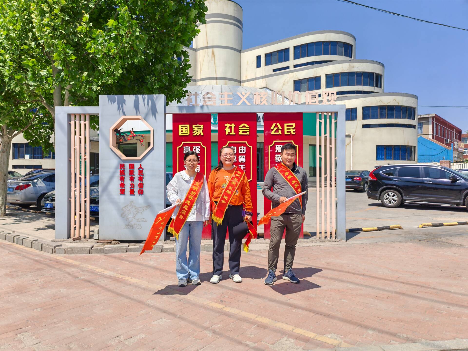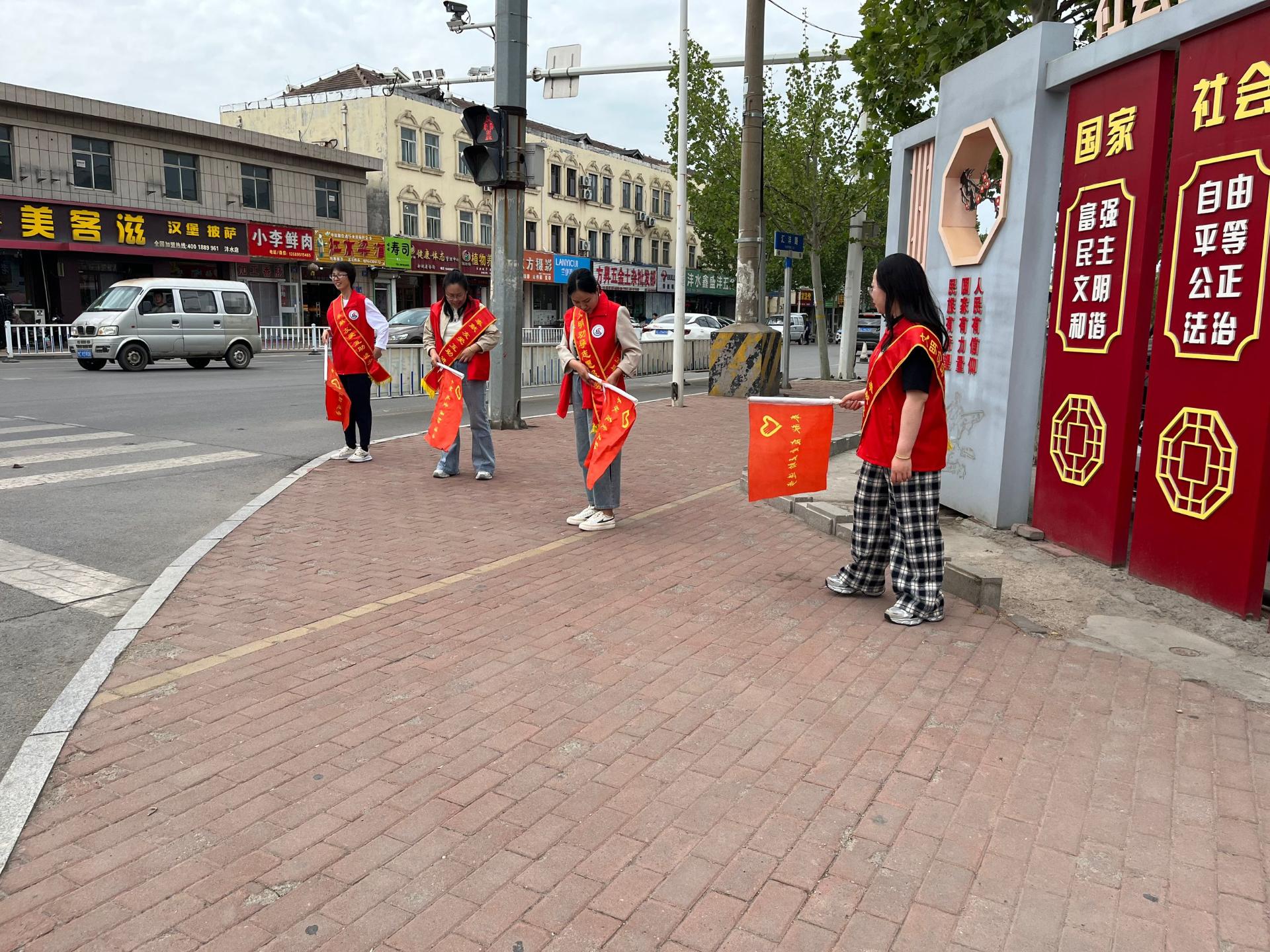 张店四中教师在校门口进行志愿服务活动,深刻践行志愿精神,提高学校文化建设及思想意识水平,践行雷锋精神。
