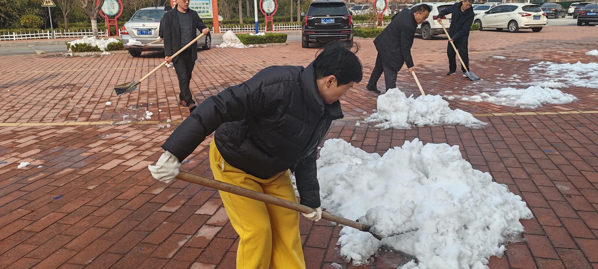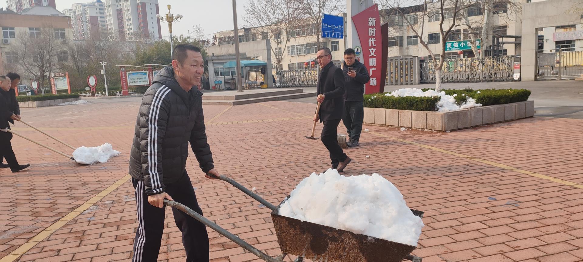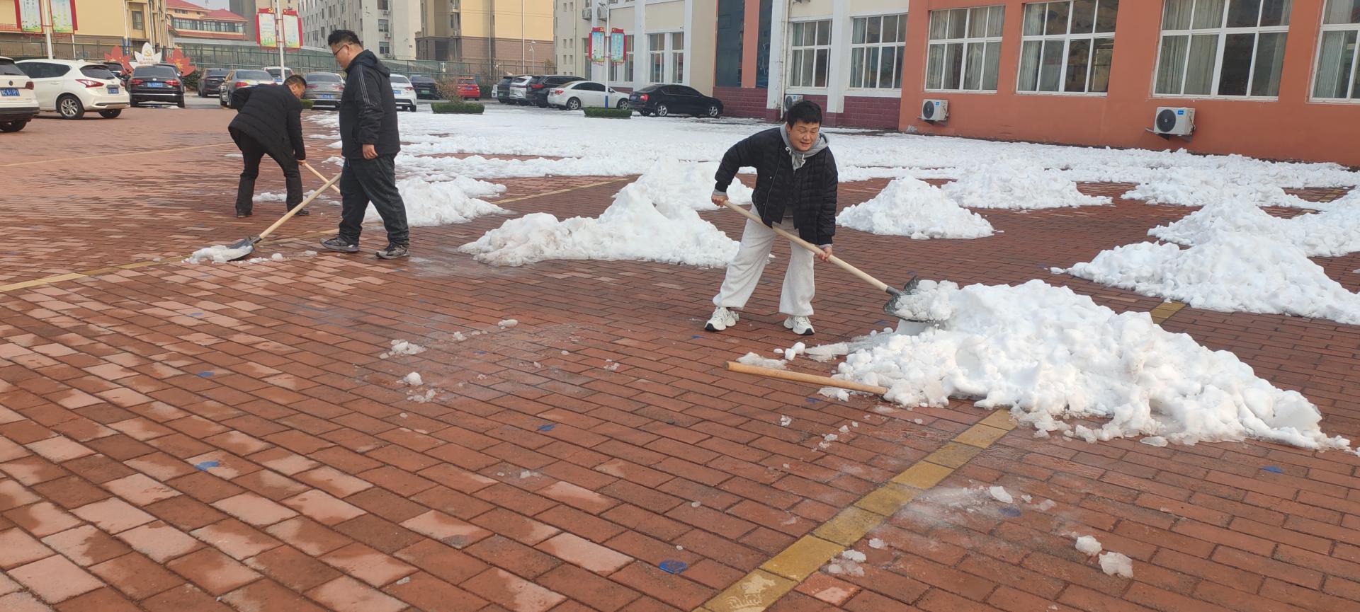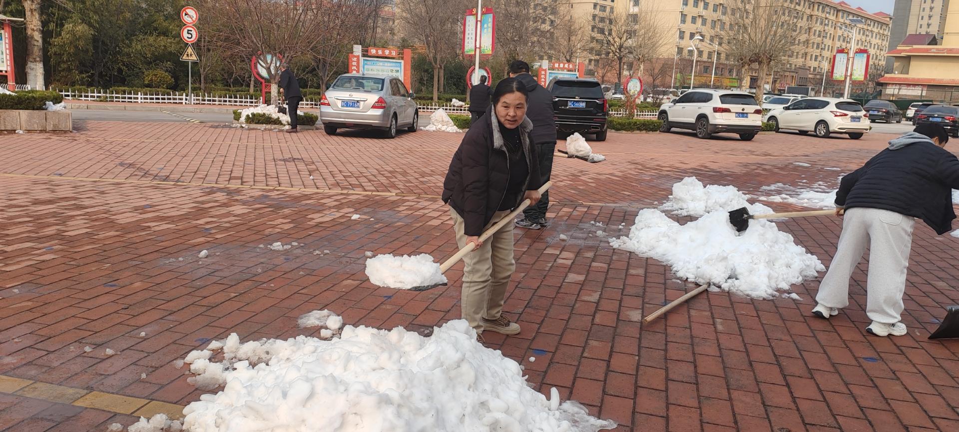 校园广场上还有大量积雪,限制了师生活动。下午第一节课后,无课老师来到广场,拿起铁锨扫帚等工具,热火朝天地干起来。
