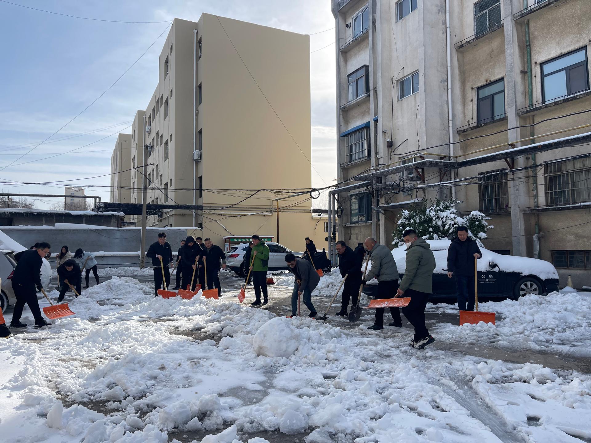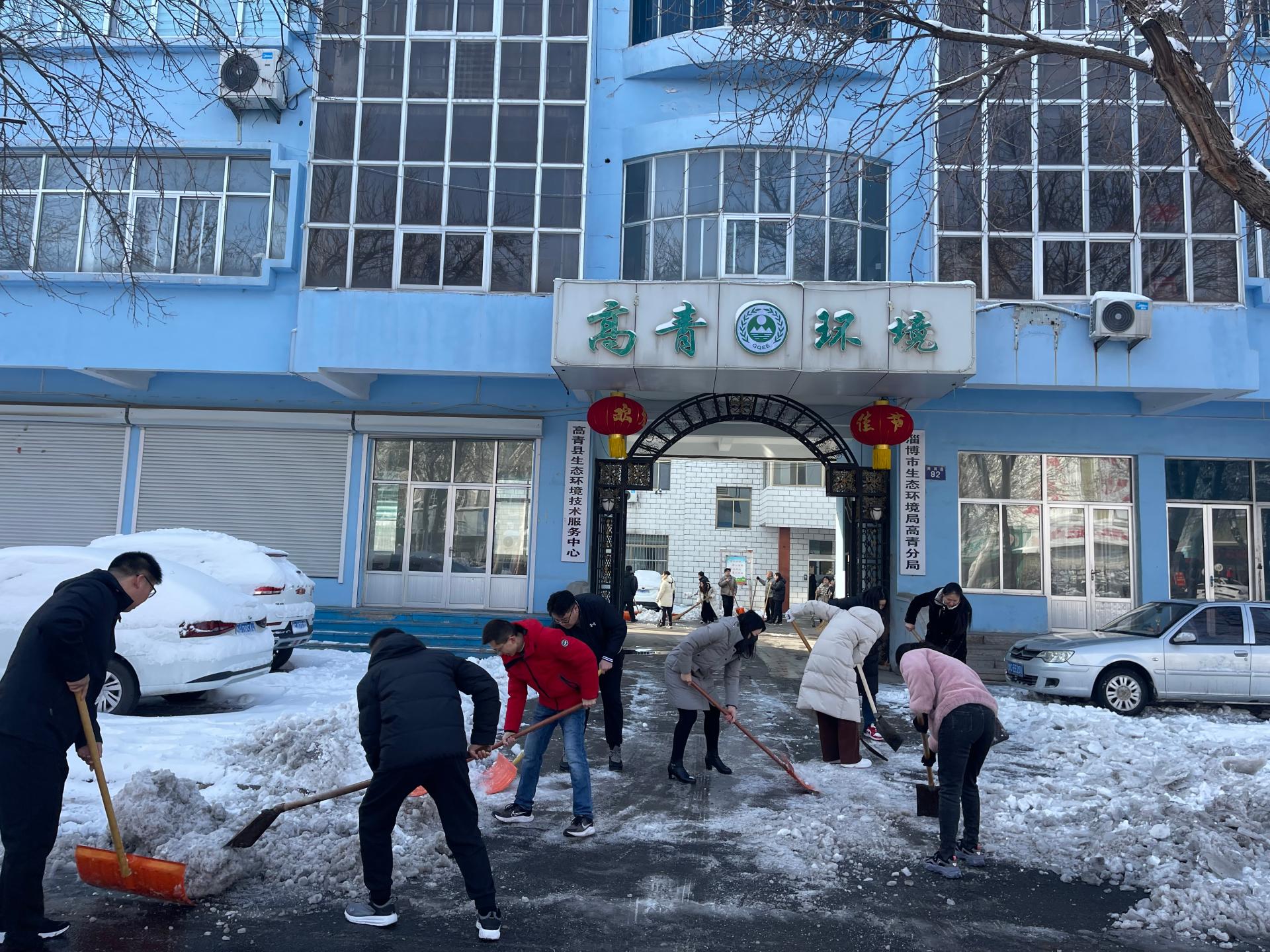淄博市生态环境局高青分局组织开展扫雪除冰活动,全体人员参加,范围包括办公院里及院外路边、家属院区域。