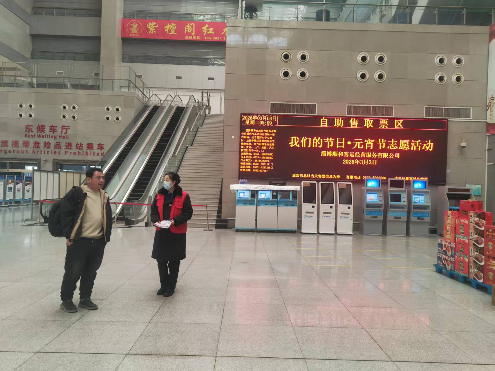淄博顺和客运公司志愿服务队于2026年“元宵节”前后在淄博客运中心一楼组织开展我们的节日主题活动,此次活动以我为群众办实事为着力点,扎根公路客运服务岗位,为旅客提供咨询、导乘、帮扶、候车、检票、接送站、安全出行宣传、照顾特殊群体等志愿服务,让旅客感受淄博的人文、节日的温馨、旅途的愉快。要求志愿者着志愿服务马甲,态度和蔼、待客热情、语言文明,讲普通话。