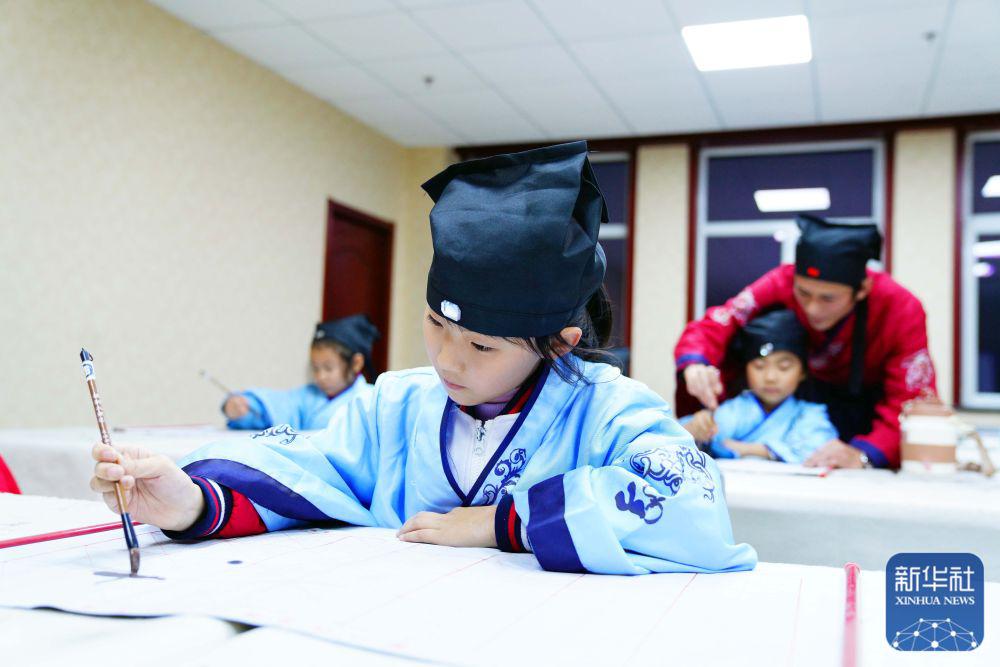 11月19日,在桓台县果里镇伊家村乡村“复兴少年宫”,孩子们在练习书法。
